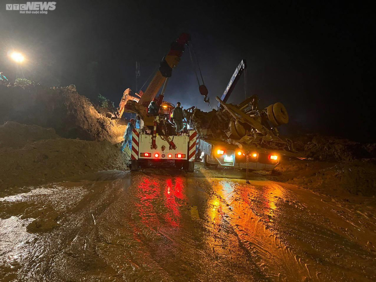 Các phương tiện cơ giới như máy xúc và lực lượng chức năng vẫn liên tục làm việc, xử lý hiện trường vụ sạt lở.