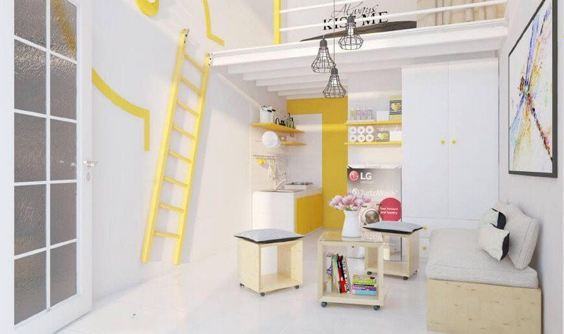 Cả căn phòng bừng sáng và tươi trẻ hơn với hai màu chủ đạo là trắng và vàng. Căn gác lửng được thiết kế với thang đứng đi lên, khi không cần sử dụng đến có thể ốp sát vào tường để tạo khoảng trống cho căn phòng.