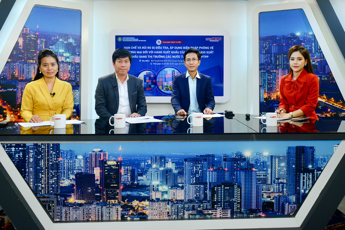 Tọa đàm "Hạn chế và rủi ro bị điều tra, áp dụng biện pháp phòng vệ thương mại với hàng xuất khẩu của Việt Nam khi xuất sang thị trường các nước thành viên CPTPP" do VTC News phối hợp Cục Phòng vệ thương mại (Bộ Công Thương) có sự tham dự của các khách mời: Ông Chu Thắng Trung, Phó Cục trưởng Cục Phòng vệ thương mại, Bộ Công Thương; ông Dương Quốc Tuấn, Phó Chủ tịch Hiệp hội Nhôm thanh định hình Việt Nam và bà Trang Thu Hà, Chánh Văn phòng Hiệp hội Thép Việt Nam.