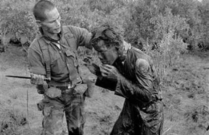 | Một binh lính Mỹ đang cho đồng đội bị thương uống nước |
