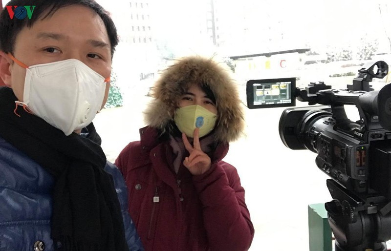 Phóng viên VOV Đinh Tuấn và đồng nghiệp đưa tin về dịch viêm phổi cấp do virus corona.