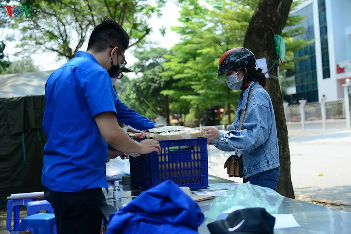 Lực lượng đoàn viên, thanh niên thuộc Thành đoàn Hà Nội làm thay nhiệm vụ của lực lượng Công an, Quân đội trong việc tiếp nhận, kiểm tra hàng hóa ký gửi bước đầu trước khi bàn giao cho đội ngũ Y tế phun xịt khuẩn và chuyển vào bên trong.