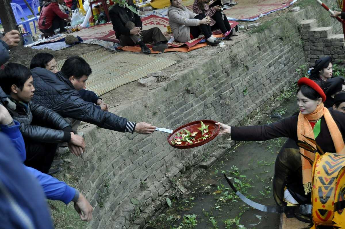 Rất đông du khách bỏ tiền vào khay trầu của các liền anh liền chị