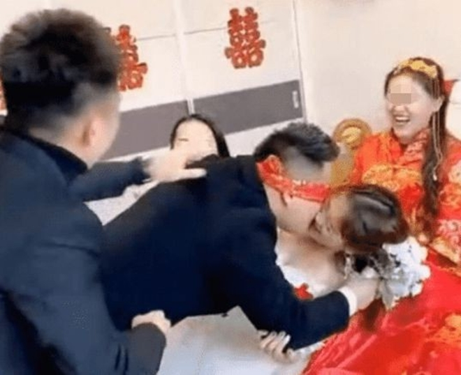 Đó là chú rể phải bịt mắt lại và tìm được cô dâu để hôn. Mọi người gây khó dễ bằng cách đẩy phù dâu ra chắn trước mặt cô dâu. Chú rể bị bịt mắt lại tưởng nhầm phù dâu là cô dâu nên ôm hôn nhiệt tình. Đáng nói, cô dâu chứng kiến toàn bộ quá trình không những không tức giận mà còn cười rất vui vẻ.
