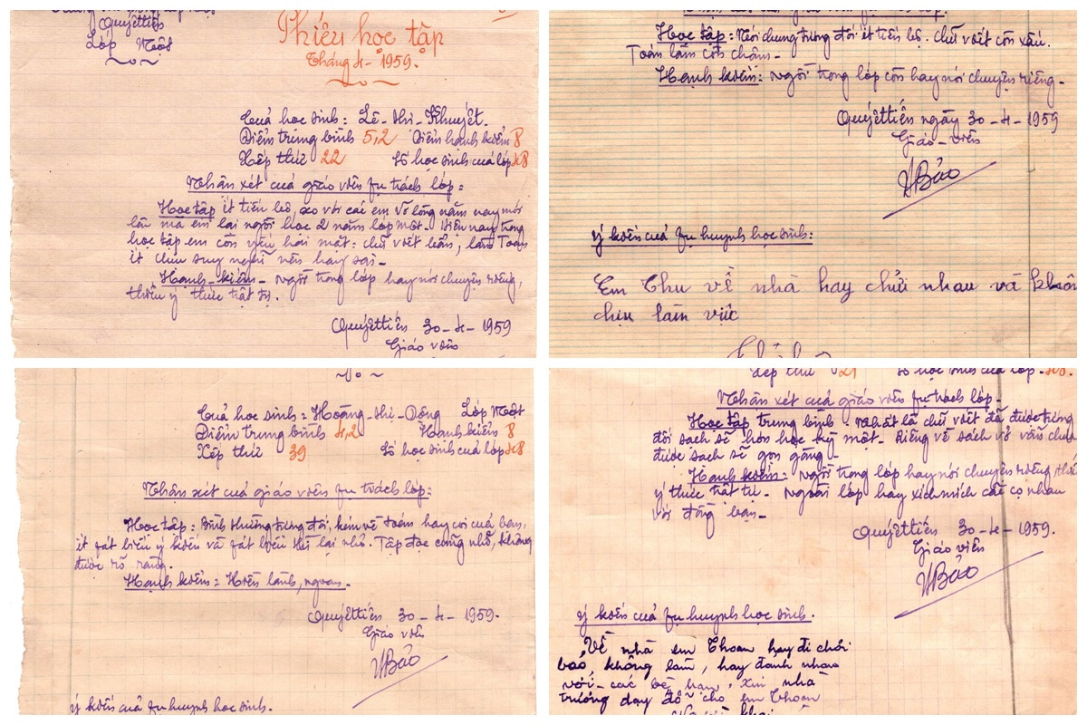 "Lời nhận xét từ giáo viên và phụ huynh trên những tờ phiếu học tập lớp 1, niên khóa 1958-1959 (giống như sổ liên lạc bây giờ) của thế hệ ông bà miền Bắc cách đây đã 64 năm. Có lẽ tuổi học trò thời nào cũng "nhất quỷ nhì ma" như nhau cả. Ngày xưa học đứng nhất nhì lớp vẫn bị thầy cô, bố mẹ chê tơi tả, giờ có khi xếp nhóm đội sổ vẫn được nhận giấy khen", anh Đương Nguyễn - người sáng lập trang mạng xã hội Thương Mái Trường Xưa nói.