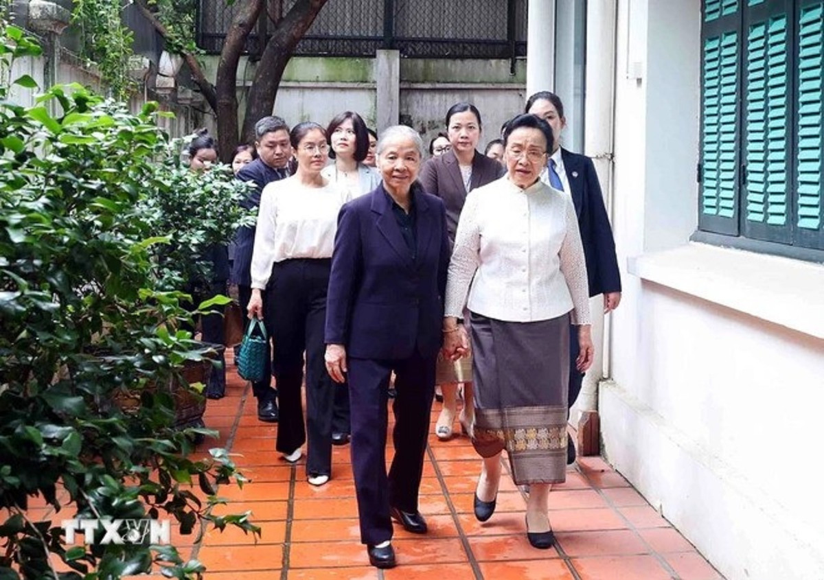 Bà Ngô Thị Mận, Phu nhân cố Tổng Bí thư Nguyễn Phú Trọng với bà Naly Sisoulith, Phu nhân Tổng Bí thư, Chủ tịch nước Lào Thongloun Sisoulith. (Ảnh: Phạm Kiên/TTXVN)