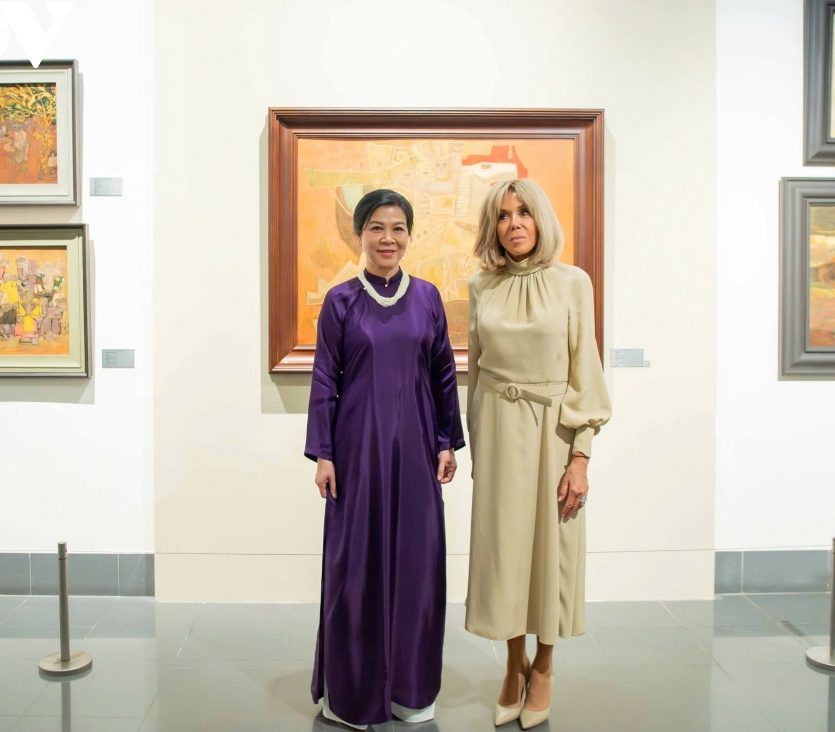 Sau khi kết thúc các hoạt động tại Văn Miếu - Quốc Tử Giám, Phu nhân Ngô Phương Ly và Phu nhân Brigitte Macron cùng đi bộ sang Bảo tàng Mỹ thuật Việt Nam để tham quan.