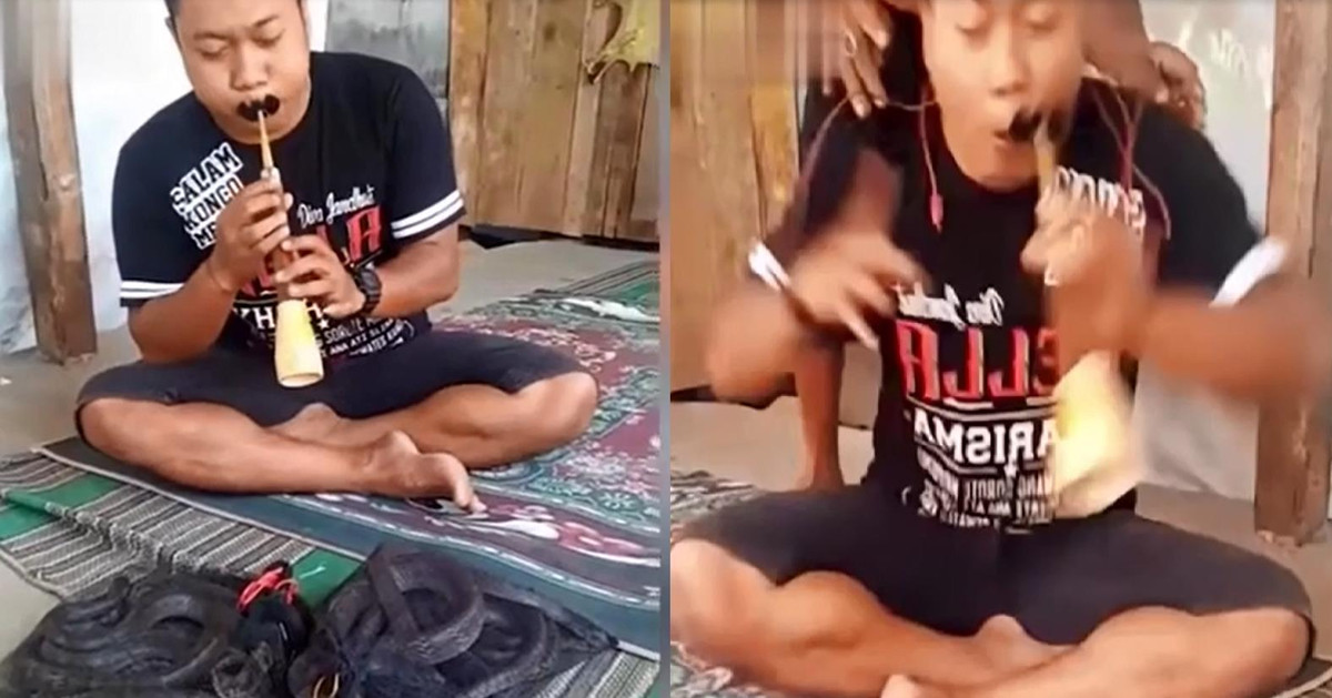 Đang thổi kèn thôi miên rắn, chàng trai kinh hoàng nhảy dựng khi có sợi dây quàng vào người, tưởng bị rắn quấn, chẳng khác chuyện phù thủy sợ ma.
