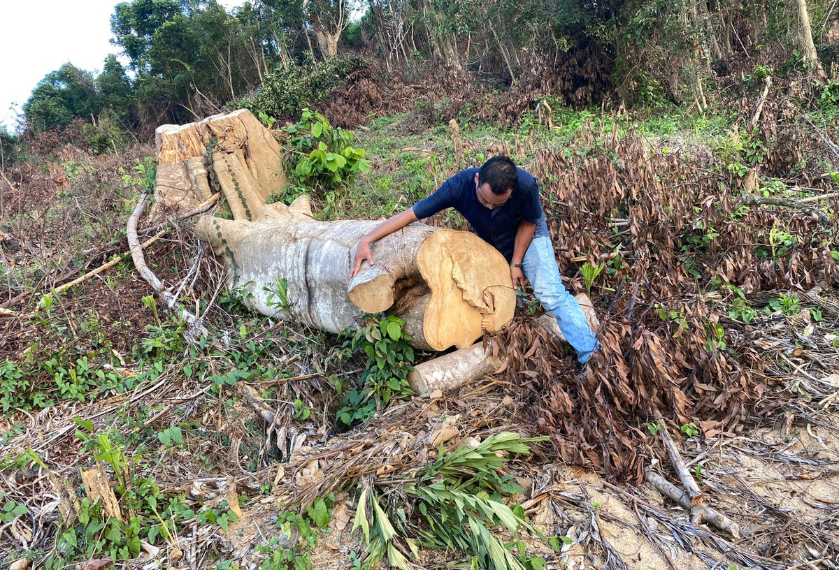 Chúng tôi thấy tại hiện trường có hơn chục cây gỗ to như: mít nài, bằng lăng, gỗ lim, da,… Có cây đường kính 100 - 140 cm vừa bị chặt hạ, còn dính trên thân cây, dăm gỗ vẫn còn vương vãi trên mặt đất.