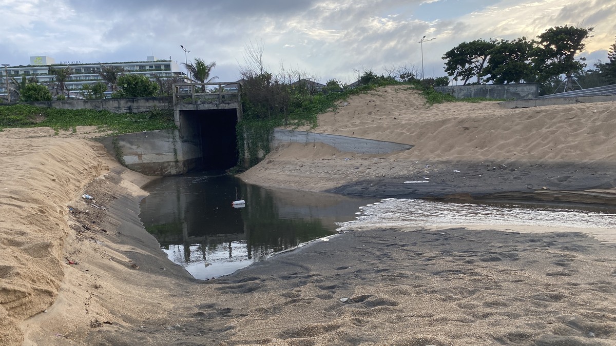 Sau trận mưa, nước từ miệng cống có màu đen và mùi hôi thải ra biển.