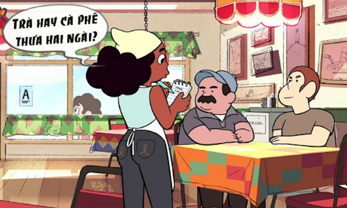 Người phục vụ rời đi, vài phút sau cô ấy quay lại với hai ly trà, và nói: