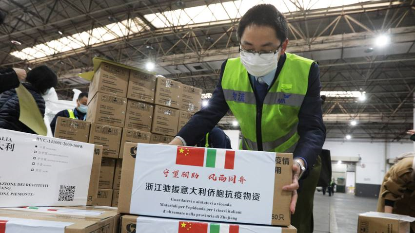 Lô vật tư Trung Quốc gửi tới Italy. (Ảnh: Tân Hoa xã)