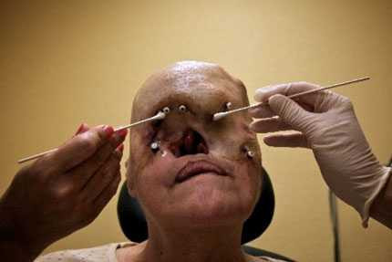Khoảng mặt từ giữa môi tới trán đã bị biến mất. Ở hốc mũi là một lỗ to màu hồng, người đối diện có thể nhìn thấu vào tận xoang. Hốc mắt mất hoàn toàn. Thậm chí, một phần xương sọ cũng bị mất.