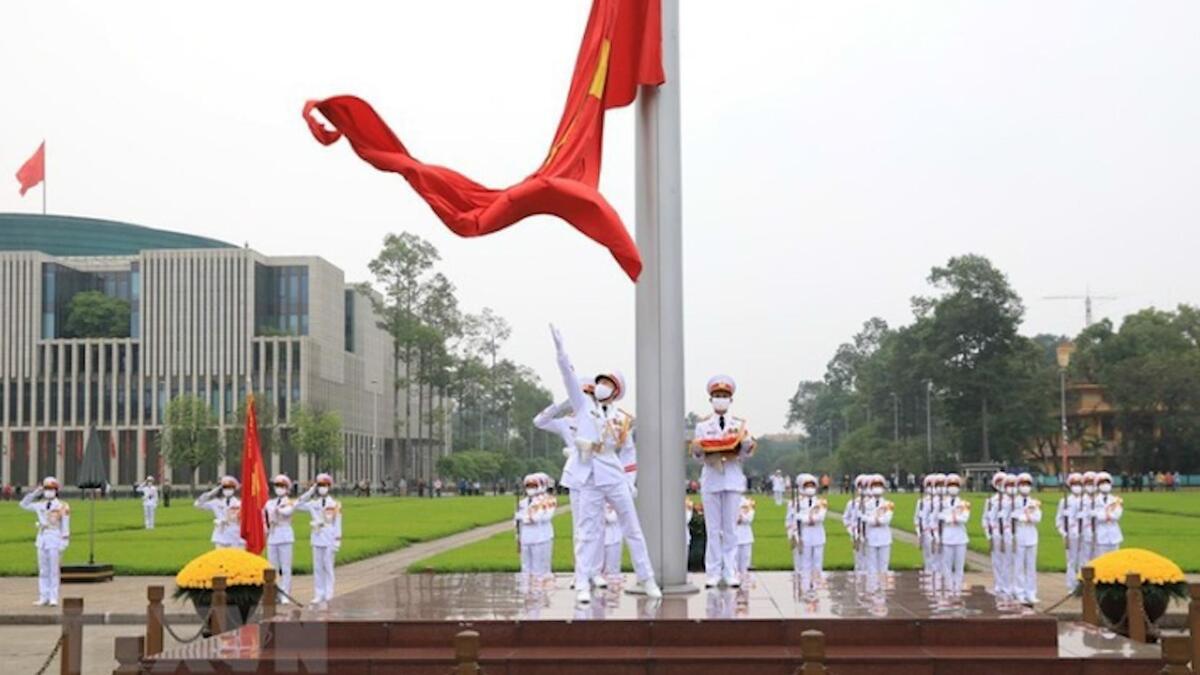 Những chiến sĩ đội tiêu binh, Đoàn 275 (Bộ Tư lệnh Bảo vệ Lăng Chủ tịch Hồ Chí Minh) thực hiện nghi lễ thượng cờ trong không khí trang nghiêm, đầy tự hào.