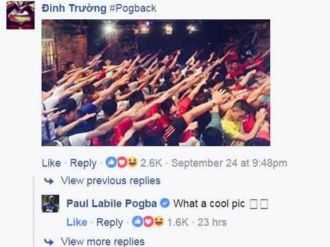 Hình ảnh này đã được một CĐV Việt Nam đăng tải trong trang facebook của Pogba (Paul Labile Pogba). Và khi chứng kiến màn ăn mừng tập thể theo đúng phong cách của mình, chàng tiền vệ người Pháp đã dành lời khen: “Một bức ảnh quá ngầu (What a cool pic)”.