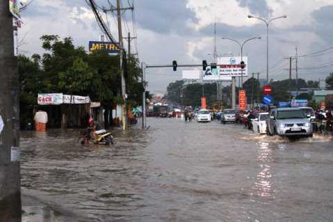 Cơn mưa lớn chiều tối 14/8 làm quốc lộ 13 (còn gọi là đại lộ Bình Dương) đoạn qua siêu thị Metro (giáp TP Thủ Dầu Một và thị xã Thuận An, tỉnh Bình Dương) lại ngập sâu và gây ùn tắc.