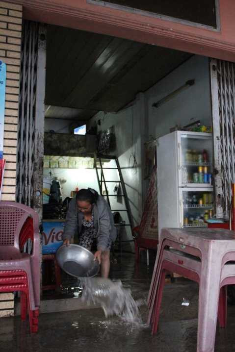 Bà Trần Thị Hiền (ngụ nhà 399/3 đại lộ Bình Dương) vừa tát nước ra khỏi nhà vừa cho biết: “Cơn mưa lớn đổ xuống chỉ hơn 30 phút là nước đã tràn vào nhà. Nước không thoát đi đâu được nên đồ đạc nhà ướt hết, tôi phải dùng thau tát ra ngoài”.
