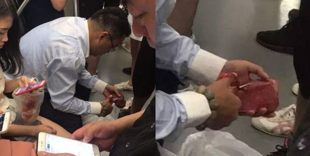 Tuy nhiên, trên chuyến tàu điện Thượng Hải số 1, xuất hiện người đàn ông cầm kéo cắt vào miếng tim lợn sống, khiến những hành khách xung quanh vừa khó chịu vừa ngạc nhiên.