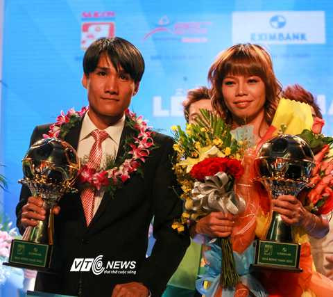 | Huỳnh Quốc Anh, Đặng Thị Kiều Trinh nhận danh hiệu Quả bóng vàng Việt Nam (Ảnh: Hoàng Hùng) |