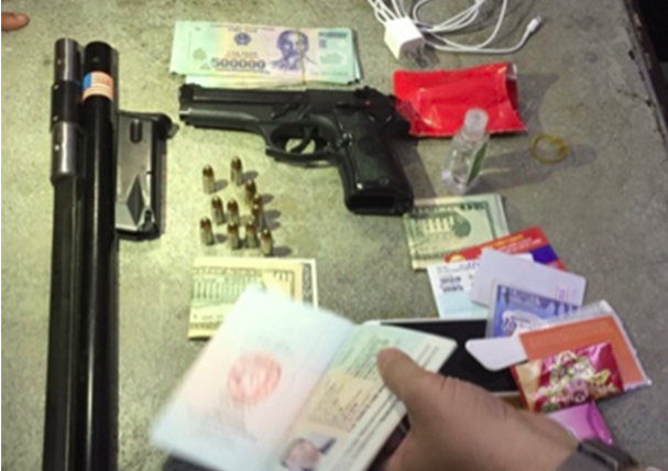 Tại đây, tổ công tác phát hiện Vũ Trọng Nghĩa (SN 1995, ngụ Hải Phòng) mang theo 1 khẩu súng quân dụng, trong băng đạn có 11 viên đạn, 1 cây kiếm, 1 gói bột chứa tinh thể rắn (nghi ma túy đá).