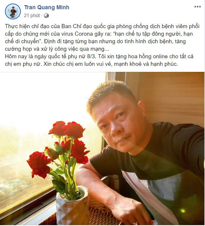 Trong khi đó, BTV Quang Minh cũng gửi lời chúc ý nghĩa tới chị em nhân ngày này. Anh không quên kèm theo lời nhắn mọi người hạn chế tụ tập đông người để tránh lây lan dịch bệnh.