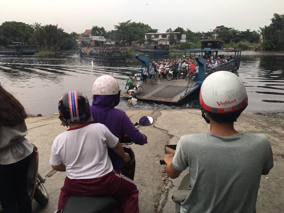Chiều 20/12, người đàn ông mặc đồng phục Grab chở một phụ nữ phía sau chạy đến chân bến phà An Phú Đông (TP.HCM).