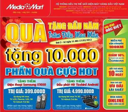 Chương trình khuyến mại "Quà tặng đầu năm, trăm điều may mắn" đợt thứ 3 sẽ được thực hiện tại toàn bộ các hệ thống siêu thị của Media Mart, kéo dài trong một tuần từ ngày 11 cho tới ngày 17/2. Ngoài việc tăng thêm về số lượng, giá trị của quà tặng đầu năm cũng được Media Mart nâng lên so với các dịp trước.