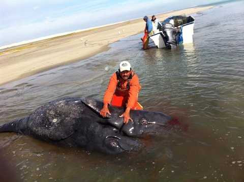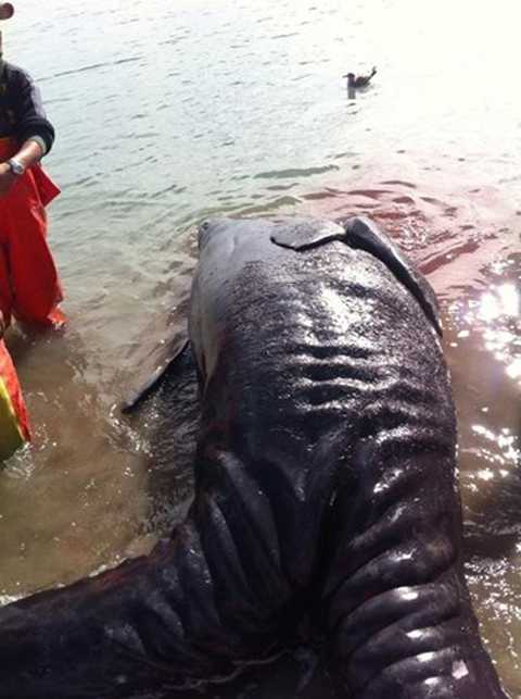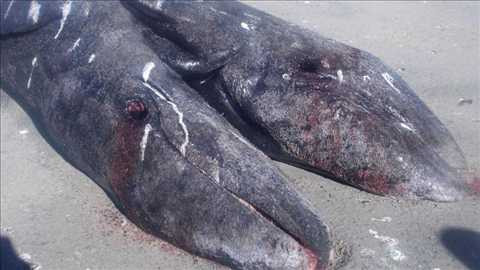 | Qua giám định, các chuyên gia cho biết con quái vật hai đầu này thực chất là một cặp cá voi xám sinh đôi bị dính liền thân. |