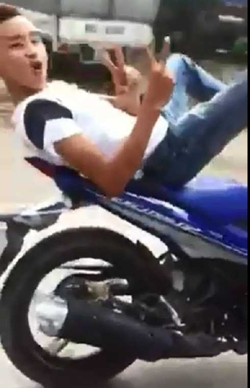 Trong đoạn video "lái xe bằng chân"dài hơn một phút, thanh niên điều khiển xe máy hiệu Exiter không đội mũ bảo hiểm, nằm ngửa người về phía sau yên xe và điều khiển tay lái bằng chân.