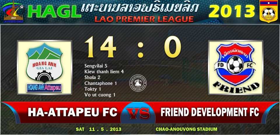 14-0. Đấy là kết quả trận đấu giữa HAGL Attapeu và đội đang đứng chót bảng Friend Development FC. Kiều Thanh Liêm ghi 4 bàn, Sengvilay đóng góp 5 bàn, Olushola lập một cú đúp; ba bàn còn lại thuộc về Võ Út Cường, Chantaphone và Tokty.