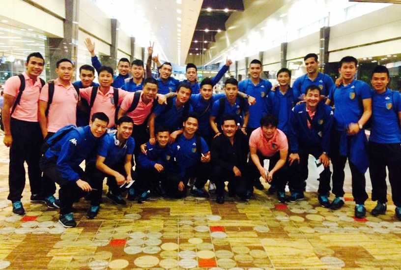 Toàn đội Hà Nội T&T chụp ảnh lưu niệm ở sân bay Changi, Singapore khi di chuyển đến Indonesia.