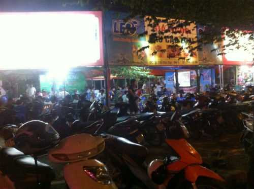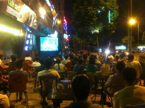 | Người dân tụ tập trước các quán có màn hình lớn khu vực đường Lê Đức Thọ |