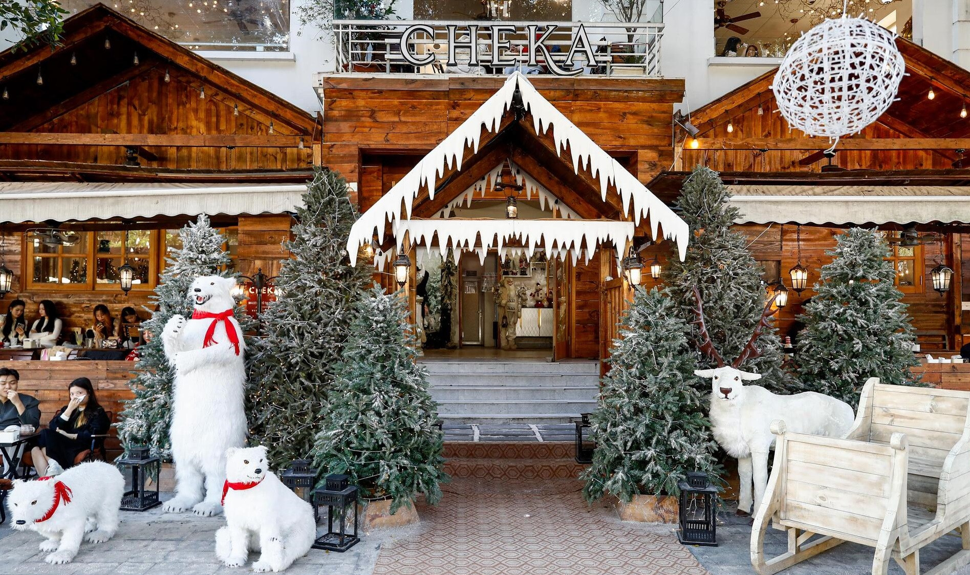 Bên trong, khách dễ dàng bắt gặp những góc chụp đậm chất Giáng sinh, decor theo phong cách Bắc Âu ấm áp. Điểm “sống ảo” hút giới trẻ nhất là khu phủ đầy tuyết trắng, nơi đặt chiếc xe tuần lộc sáng đèn và ngôi nhà gỗ nhỏ ấm ánh sáng.