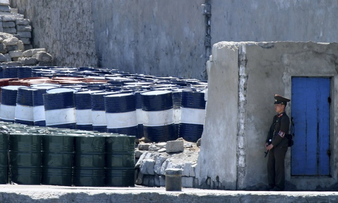Quân nhân Triều Tiên canh gác kho nhiên liệu tại Sinuiju, đối diện thành phố Đan Đông của Trung Quốc giáp biên giới hai nước. (Ảnh: AP)