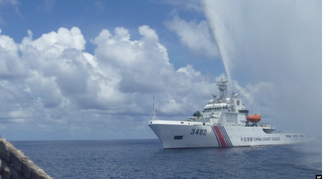 Tàu hải cảnh Trung Quốc phun vòi rồng đe dọa tàu Philippines (Ảnh: AP).