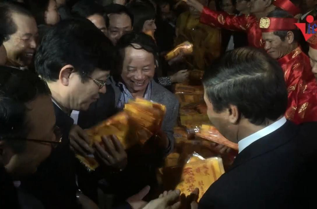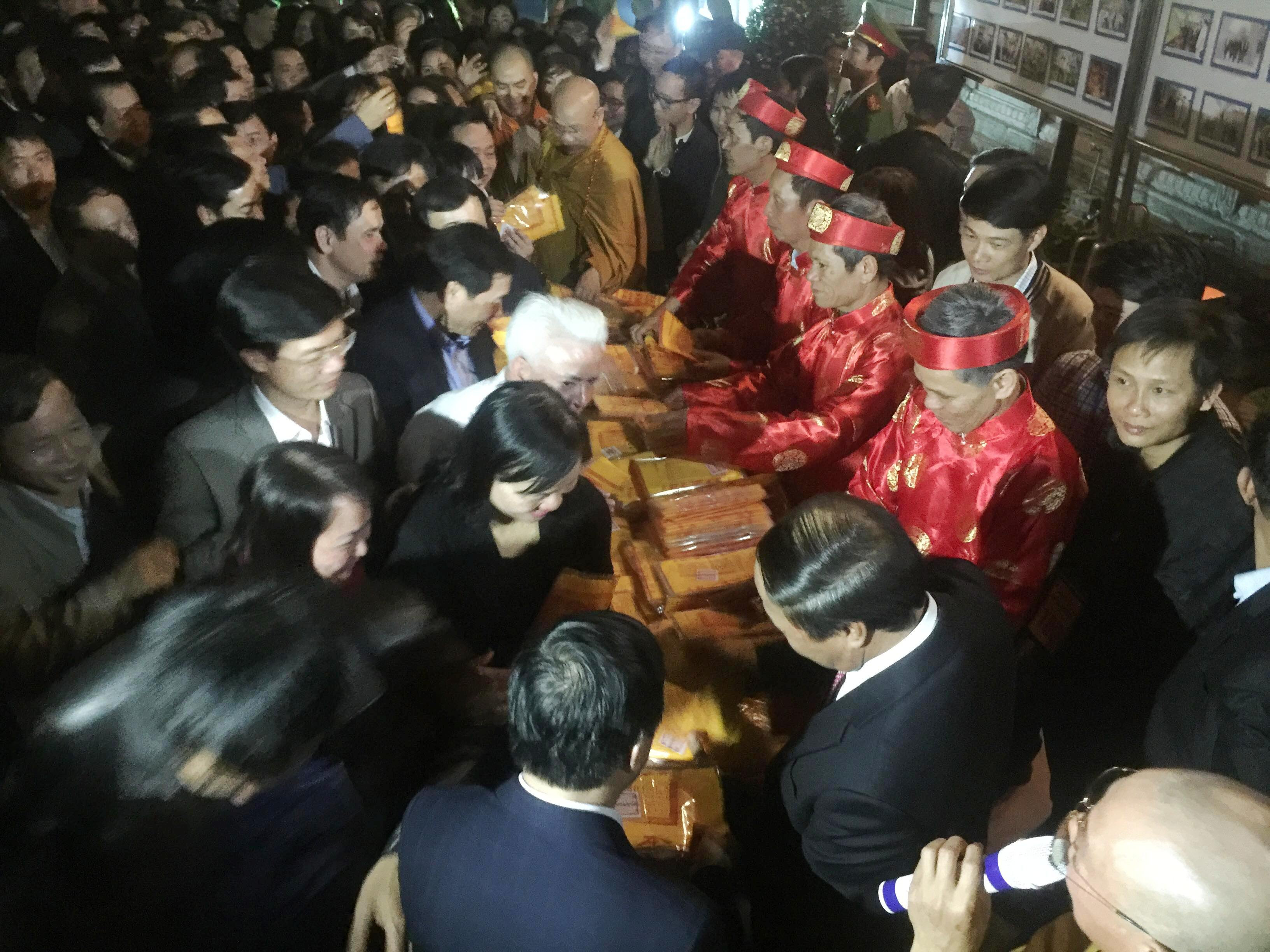Cuối giờ chiều 1/3 (tức 14 tháng Giêng), đoàn lãnh đạo của TP Hải Phòng cùng một số lãnh đạo các sở, ngành, quận, huyện đến thắp hương và xếp hàng tại Lễ hội phát ấn ở khu di tích Bạch Đằng Giang (huyện Thủy Nguyên, Hải Phòng).