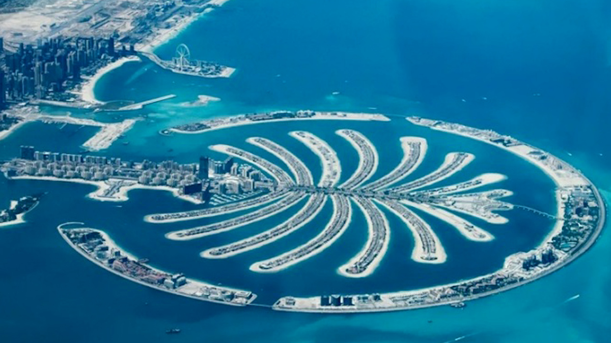 Quần đảo hình cây cọ Palm Jumeirah rộng 5,72 km ở ngoài khơi Dubai, được bao bọc bởi vành cung hình trăng lưỡi liềm.