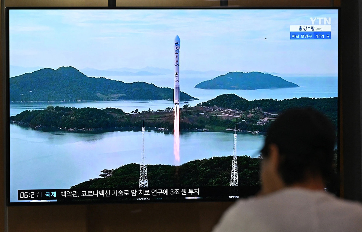 Người dân Hàn Quốc theo dõi bản tin về vụ phóng vệ tinh của Triều Tiên qua truyền hình ở Seoul, ngày 24/8/2023. (Ảnh: AFP/TTXVN)