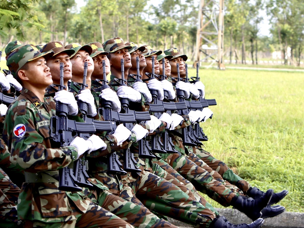 Không khí trên thao trường như nóng hơn bởi sức trẻ và nhiệt huyết của đội quân đến từ Vương quốc Campuchia. Những giọt mồ hôi lăn dài trên gương mặt rắn rỏi, nhưng đôi mắt họ không rời hàng lối, tất cả cùng hòa nhịp trong sự nghiêm cẩn và gắn kết.