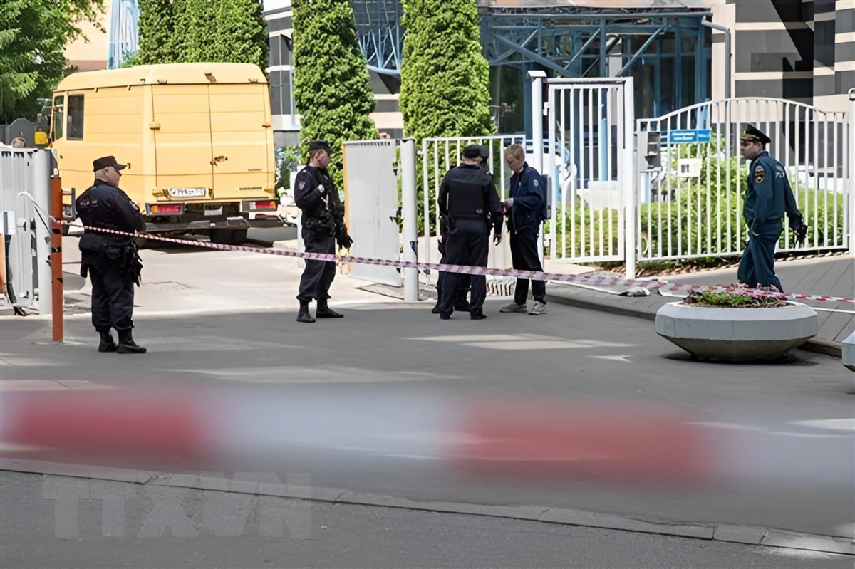 Lực lượng chức năng phong tỏa hiện trường thiết bị bay không người lái tấn công ở thủ đô Moskva, Nga, ngày 30/5/2023. (Ảnh: THX/TTXVN)