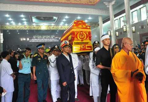 | Linh cữu bốn chiến sĩ hy sinh khi làm nhiệm vụ trên chuyển bay UH-1 được đưa ra xe tang |