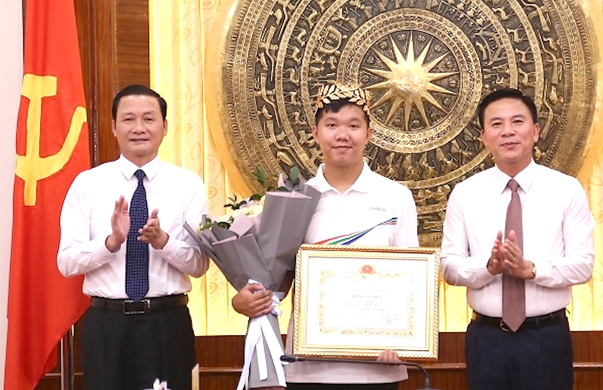 Bí thư Tỉnh ủy Thanh Hoá Đỗ Trọng Hưng (phải) và Chủ tịch UBND tỉnh Đỗ Minh Tuấn (trái) trao bằng khen cho Lê Xuân Mạnh.