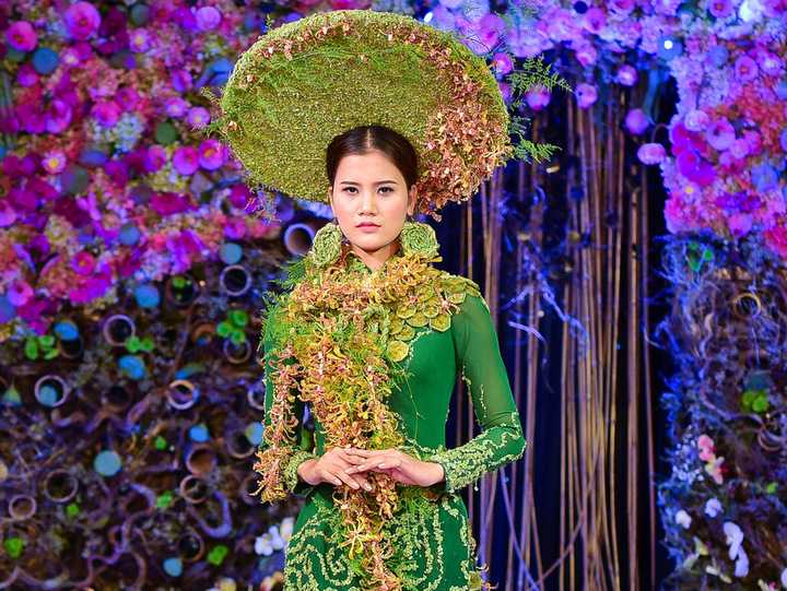 | Trên sân khấu sự kiện truyền thống, nữ người mẫu trưởng thành từ Vietnam’s Next Top Model 2015 kiêu sa trong bộ áo dài họa tiết hoa tươi do các chuyên gia về hoa sáng tạo. Sau phần giới thiệu các tác phẩm của thí sinh, nhà thiết kế hoa Cao Sơn trình làng 6 bộ áo dài do chính anh thiết kế và tự tay kết hoa. |