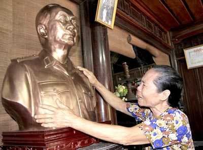 | Bà Võ Thị Lài ở An Xá, khóc thương trước tượng bán thân Đại tướng Võ Nguyên Giáp. |