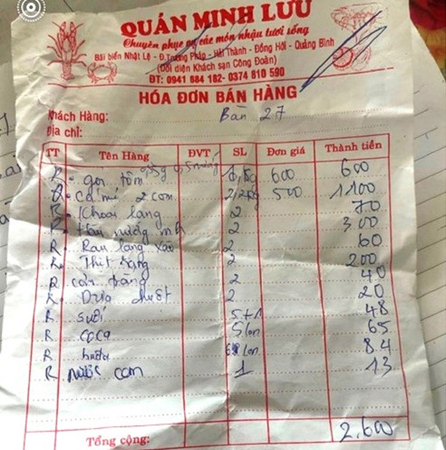 Hóa đơn bữa ăn trưa tại nhà hàng hải sản Minh Lưu. Ảnh: CTV