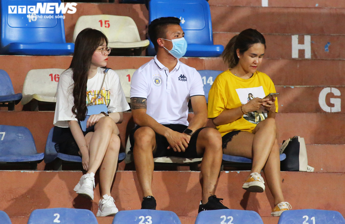 Ở trận đấu giữa Hà NộI FC vs Sài Gòn FC ở vòng 7 này, Quang Hải không được đăng ký thi đấu. Anh cùng bạn gái Huỳnh Anh ngồi trên khán đài theo dõi trận đấu.