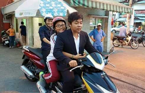 | Quang Lê không đội mũ bảo hiểm khi chở Phương Mỹ Chi trên đường phố. |
