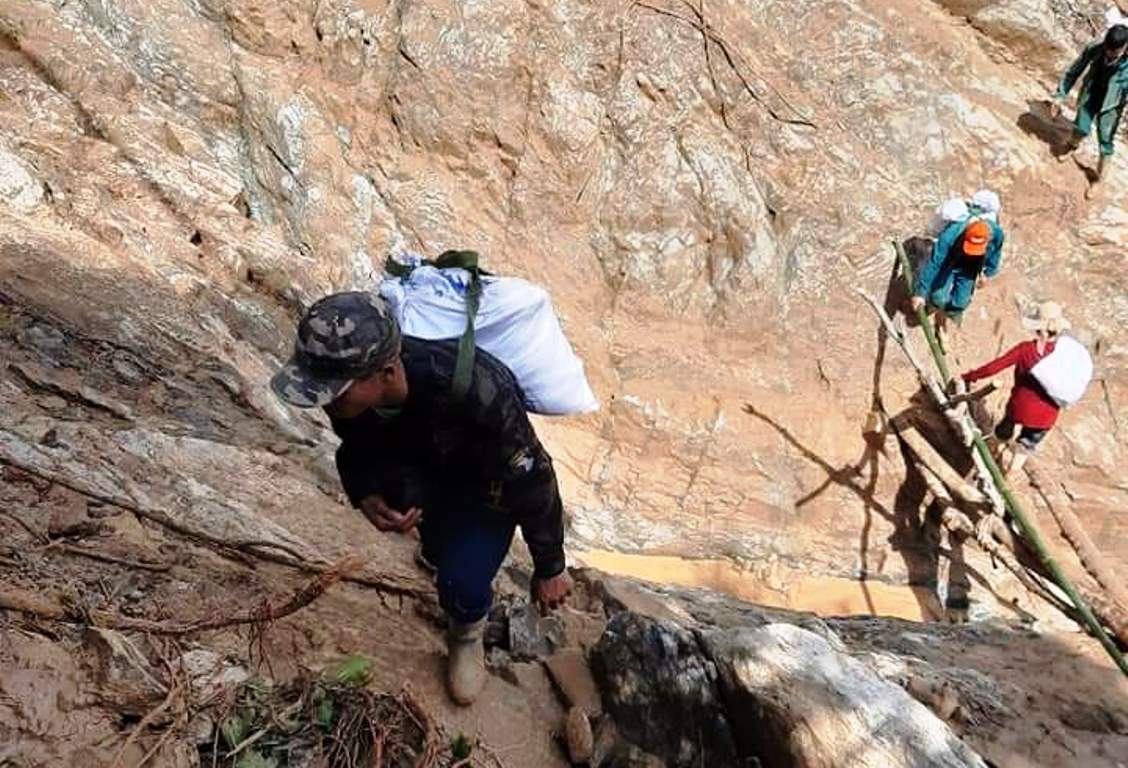 Với địa hình đồi núi dựng đứng, vách đá trơn trượt nên khi gùi cõng 25kg hàng hóa trên lưng, lực lượng dân quân phải rất thận trọng trong mỗi bước di chuyển.