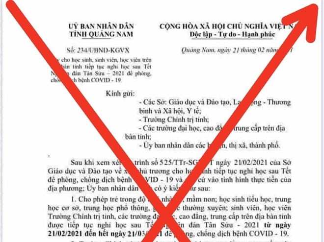Như VTC News đưa tin, ngày 21/2, mạng xã hội lan truyền văn bản với nội dung thông báo cho học sinh Quảng Nam nghỉ học từ 21/2 đến hết 21/3/2021.