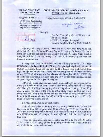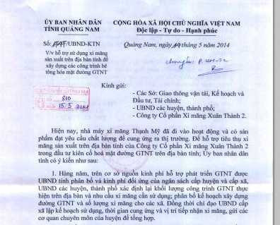 Theo đó ngày 14-5-2014, ông Đinh Văn Thu, Phó chủ tịch Thường trực UBND tỉnh Quảng Nam, đã ra công văn số 1747/UBND-KTN với nội dung : “hỗ trợ sử dụng xi măng sản xuất trên địa bàn tỉnh để xây dựng các công trình bê tông hóa mặt đường giao thông nông thôn (GTNT)”.